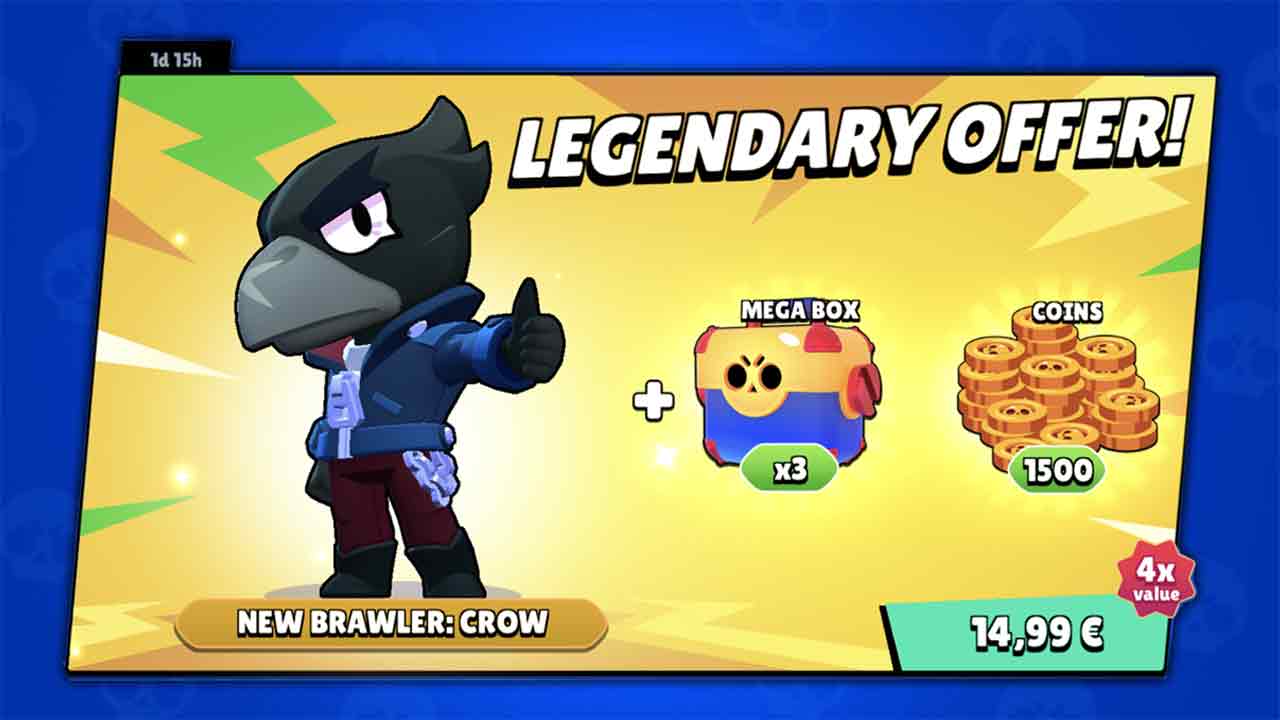 Eines dieser Angebote ist der legendäre Brawler Crow inklusive drei Megaboxen und 1500 Gold für gerade mal 15€. Es ist lange her, dass ein legendärer Brawler für diesen Preis erhältlich war, da legendäre Brawler normalerweise für 700 Juwelen, also ca. 40€ verkauft werden. Solltest du Crow also noch nicht freigeschalten haben und es dir nichts ausmachen etwas Geld für Brawl Stars auszugeben, dann schlage auf jeden Fall zu.